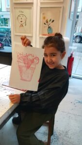 Farbe aufs Glas, mit einer Rolle verteilen, Papier darauf legen und mit einem Bleistift zeichnen. Nachdem das Blatt umgedreht wurde, kamen unter anderem farbige Schlangen, Fantasietiere und Blumenvasen zum Vorschein. Der Überraschungseffekt beim Drucken überraschte einige Kinder – vor allem, als fleißig Buchstaben geschrieben wurden, die am Ende spiegelverkehrt auftauchten…