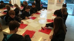 Danach ging es direkt zum Nachbartisch, an dem die Schüler und Schülerinnen mit Karton und schwarzer Farbe Muster auf rotes Papier drucken konnten. Auch Papiertüten wurden mit Korken- und Kartonkantendruck in hübsche Geschenktüten verwandelt.