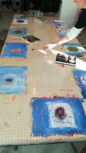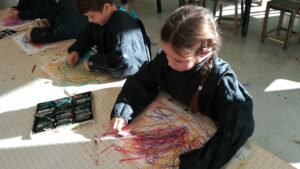 Zum Abschluss durften die Jungen und Mädchen noch eine ganz besondere Technik ausprobieren: zwei Wachsmalkreiden wurden in beide Hände genommen und damit wie wild auf große Bögen gekritzelt. Nach zehn Sekunden gab’s zwei neue Farben und so weiter – bis das ganze Papier vollständig bunt war. Nun wurde weiße oder blaue Acrylfarbe mit Spachteln auf dem Kunstwerk verteilt und jeder durfte seine schönste bunte Stelle „frei“ lassen. Eine fantastische Wirkung!