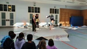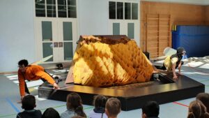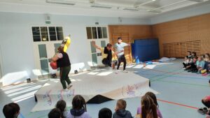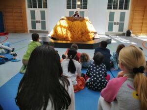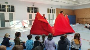 Während der etwa einstündigen Vorstellung wurde die Turnhalle kurzerhand zum Theater und die Kinder tauchten staunend in fantasievolle Welten ab.