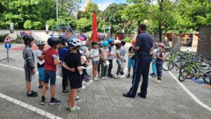 Die Viertklässler wurden im Schonraum Pausenhof an die praktischen Übungseinheiten herangeführt. Dies übernahmen Verkehrspolizisten, die viel Geduld und Gelassenheit mitbrachten und während der gesamten Ausbildung auf die Sicherheit der Schüler achteten. Zum Beispiel durften die Kinder nur mit Helm fahren. An dieser Stelle einen herzlichen Dank an die Verkehrspolizisten Herrn Schauer und seine Kollegen für ihre Unterstützung.