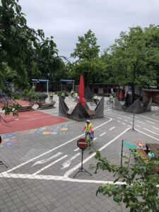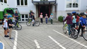 Die Viertklässler wurden im Schonraum Pausenhof an die praktischen Übungseinheiten herangeführt. Dies übernahmen Verkehrspolizisten, die viel Geduld und Gelassenheit mitbrachten und während der gesamten Ausbildung auf die Sicherheit der Schüler achteten. Zum Beispiel durften die Kinder nur mit Helm fahren. An dieser Stelle einen herzlichen Dank an die Verkehrspolizisten Herrn Schauer und seine Kollegen für ihre Unterstützung.