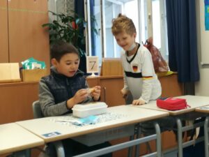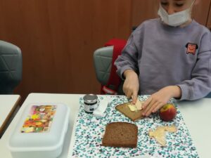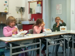 Neugierig öffneten die Schüler am Donnerstag die weißen Boxen. Darin fanden sie eine Scheibe Sauerteigbrot, Zwetschgenmus, einen Apfel und ein Säckchen Kräutertee. Gestillt wurde der Durst der Erstklässler allerdings erst einmal mit Wasser aus den neuen Trinkflaschen.