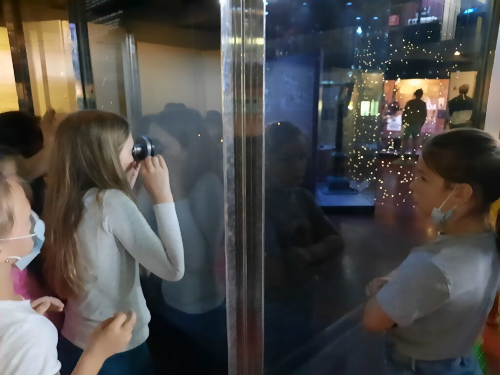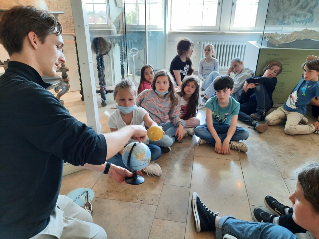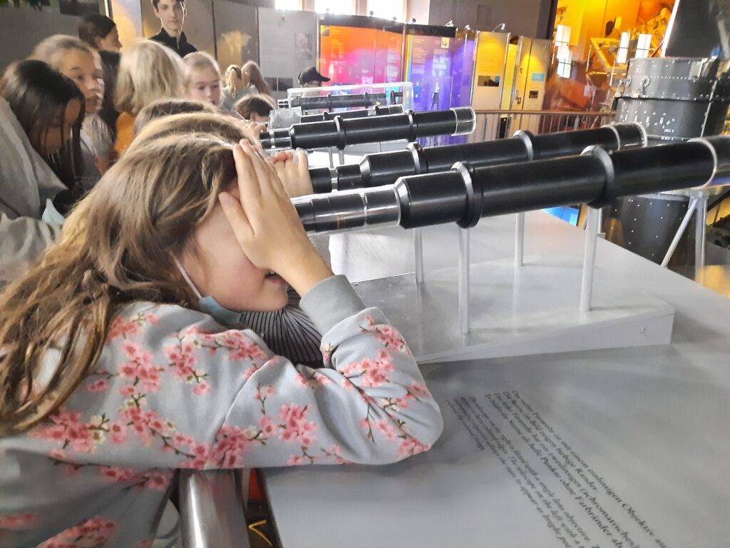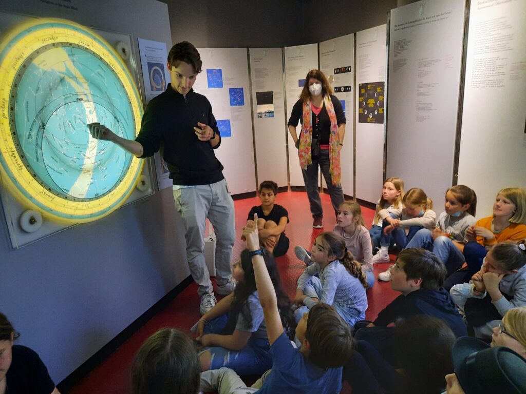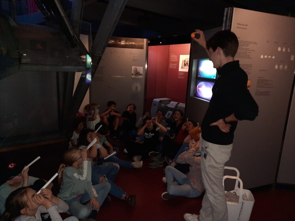 Die Führung des Museumspädagogischen Zentrums drehte sich rund um unser Sonnensystem. Nachdem Herr Matter den Kindern einige grundlegende Informationen zur Erddrehung, den Jahreszeiten und der Anziehungskraft vermittelt hatte, ging es weiter zu den Teleskopen. Dort konnten die Kinder künstliche Sternenhimmel anschauen, riesige Teleskope bewundern und kleine Modelle von Sternwarten entdecken.