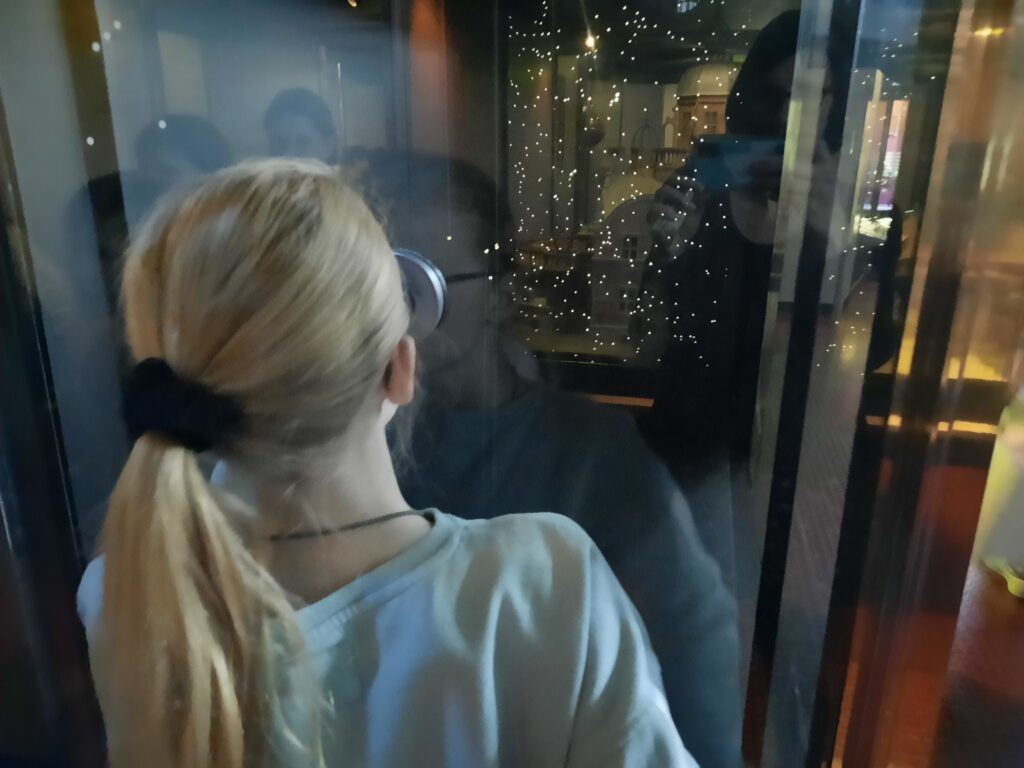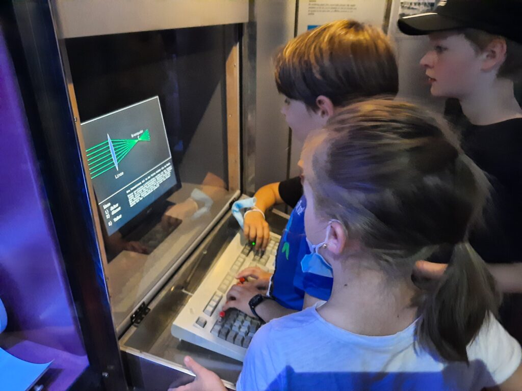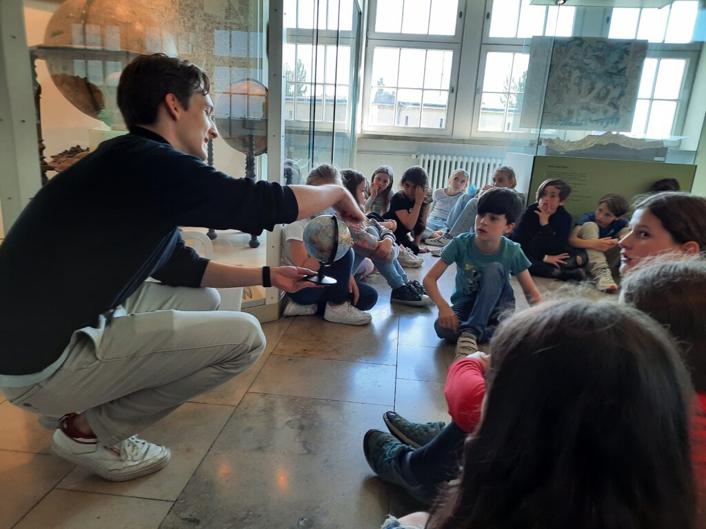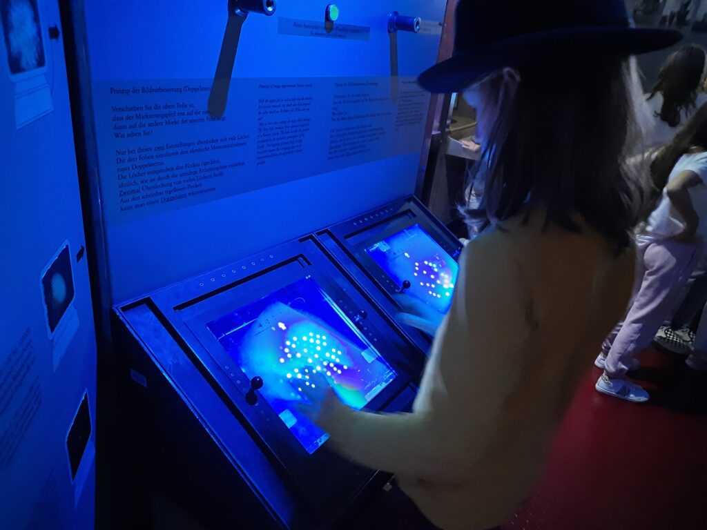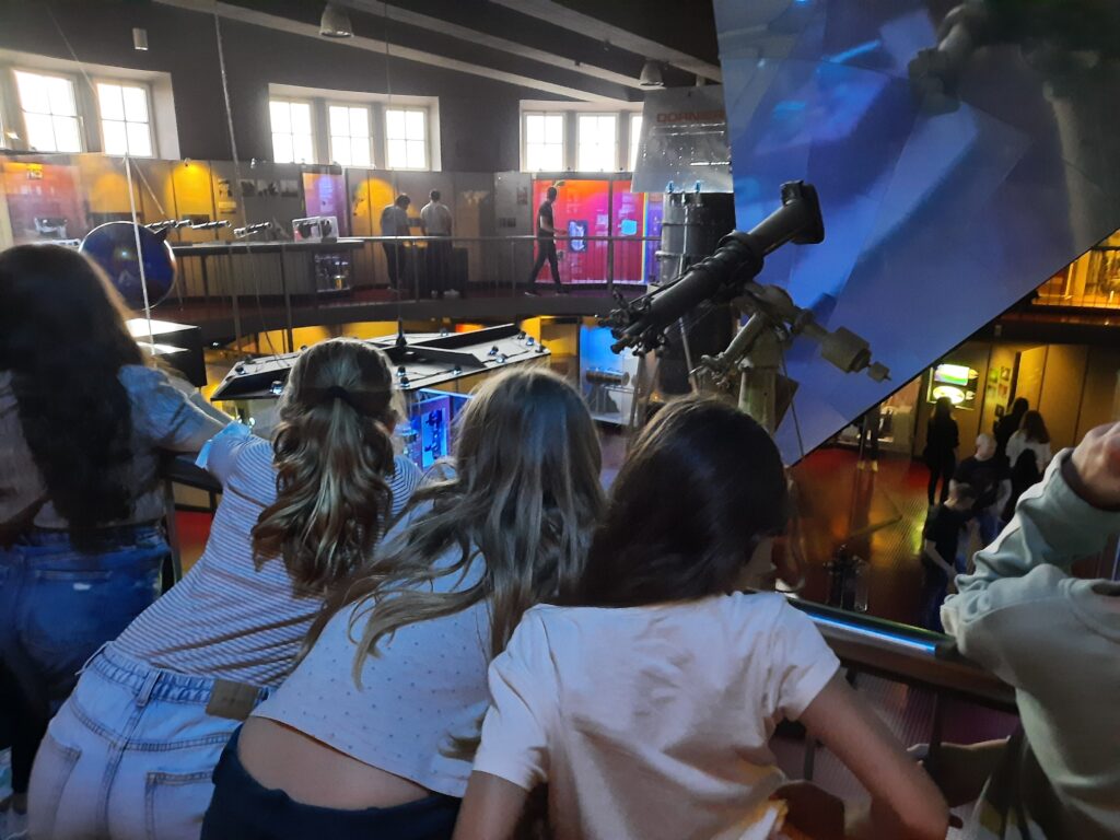 Die Führung des Museumspädagogischen Zentrums drehte sich rund um unser Sonnensystem. Nachdem Herr Matter den Kindern einige grundlegende Informationen zur Erddrehung, den Jahreszeiten und der Anziehungskraft vermittelt hatte, ging es weiter zu den Teleskopen. Dort konnten die Kinder künstliche Sternenhimmel anschauen, riesige Teleskope bewundern und kleine Modelle von Sternwarten entdecken.