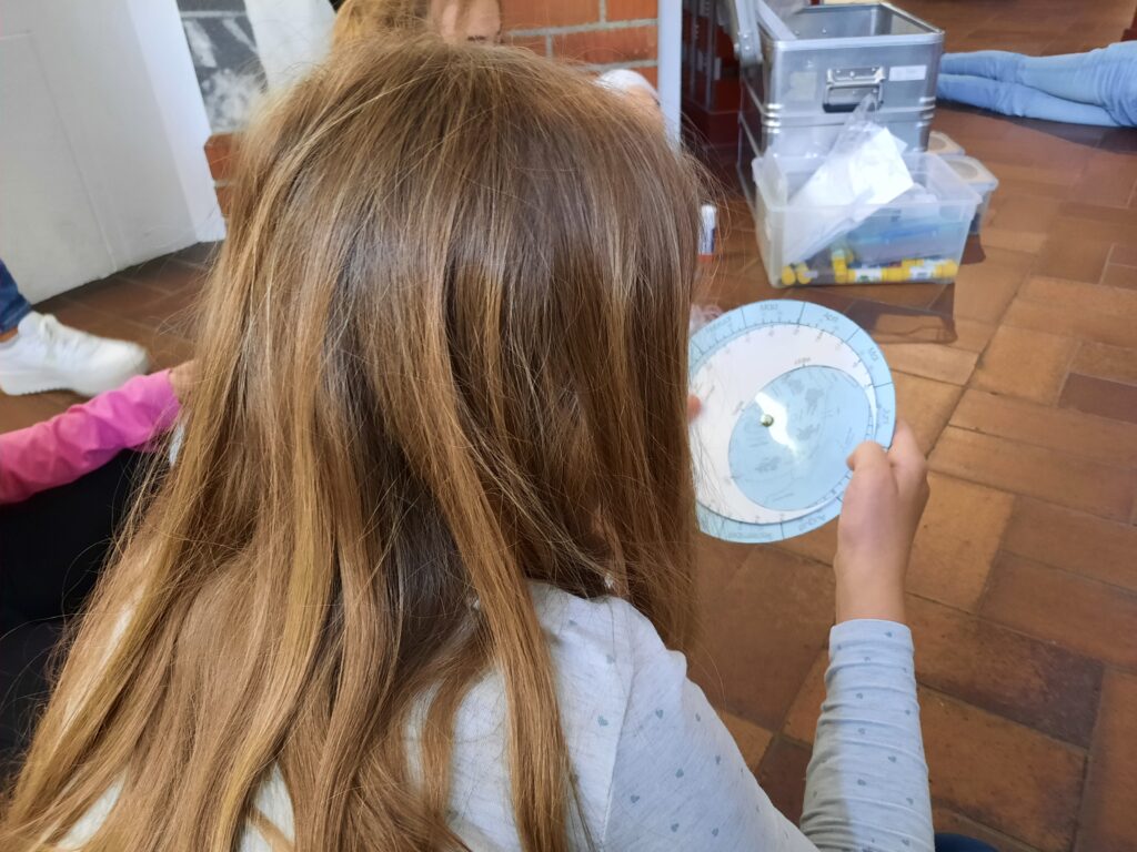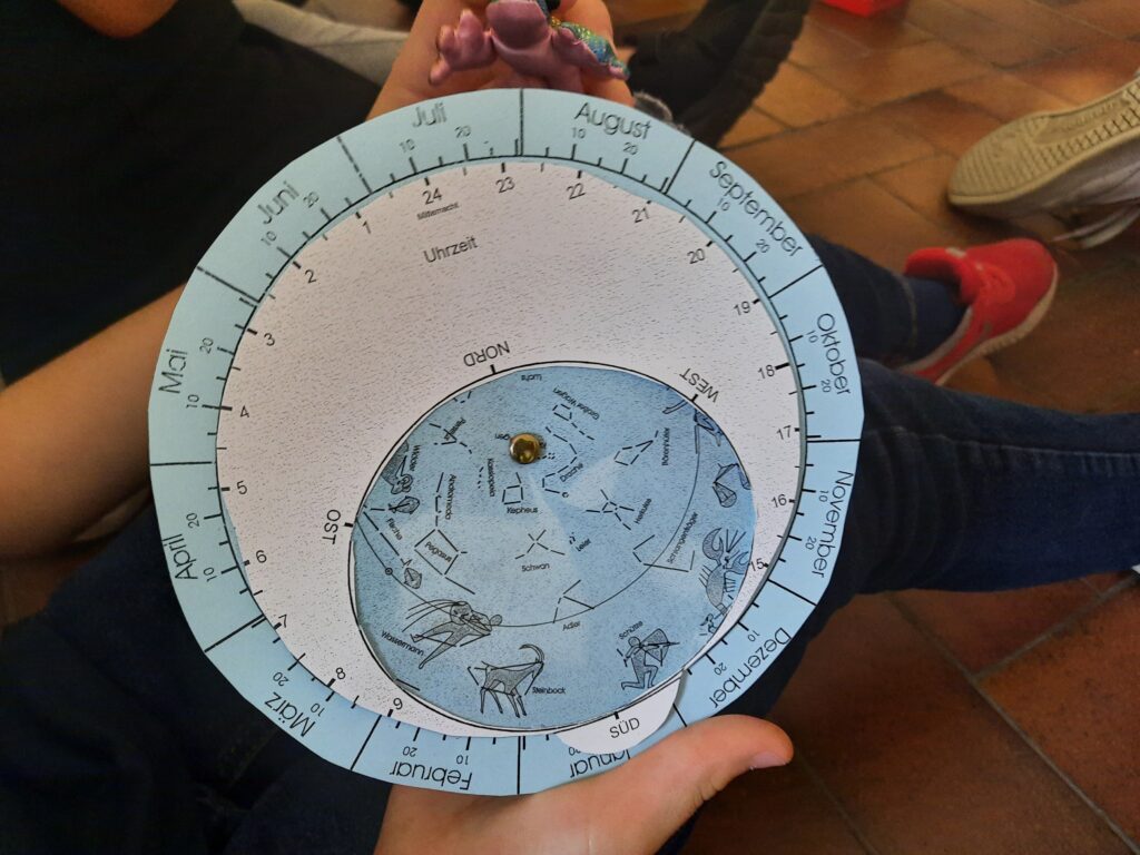 Durch Papierteleskope versuchten sie dem Lauf eines Sterns zu folgen – ein Tischtennisball, den Herr Matter kreisen ließ. Dabei bemerkten sie, dass das gar nicht so einfach ist. Nach einem kleinen Exkurs zu allen Planeten unseres Sonnensystems ging es zur Himmelsscheibe. Darauf suchten und fanden die Kinder ihre Sternzeichen und stellten den Sternhimmel für heute Abend ein. Anschließend durften sie eine solche Drehscheibe selbst basteln und können nun künftig als Hobbyastronomen tätig werden.