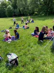 An der Isar sammelten die Kinder in Kleingruppen Müll und waren sehr erstaunt, wie viel und was sich auf einem kleinen Stück Wiese alles finden lässt. Von Socken bis Kronkorken…