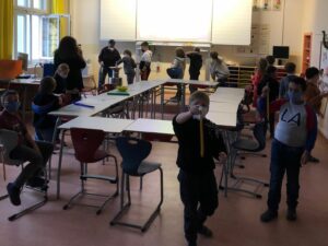 Alle Jahrgangsstufen fertigten mit ihren jeweiligen Betreuerinnen eigene Kerzen an. Dabei tauchten die Kinder den Docht immer wieder in den großen Wachstopf und ließen das Wachs dann kurz antrocknen.