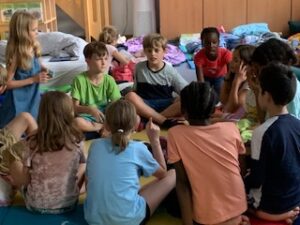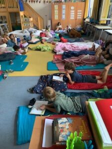 Irgendwann schliefen alle Kinder ein und am nächsten Morgen wurde leise weitergelesen bis alle wach waren. Nachdem alle Schlafplätze aufgeräumt waren, durften wir in die Mensa zum Frühstück kommen. Noch einmal ein herzliches Dankeschön an das Tagesheim für die liebe Rundumversorgung. Lecker war’s!