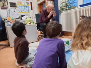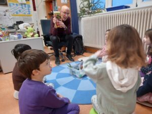 Der Autor Carlo besuchte die beiden Vorkursgruppen und las aus seinem Erstlingswerk „Tim Tyranno – Wirbel in der Schule“ vor. In dem Buch erhält der hilfsbereite, aber schwache Zweitklässler Tim von einem echten Tyranno Dinokräfte.