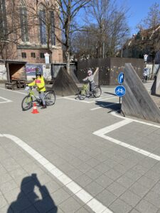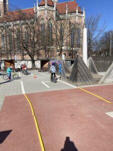 Nach den Übungen folgten die theoretische und die praktische Prüfung. Als krönender Abschluss stand nach den erfolgreich abgelegten Prüfungen der Realverkehr an, bei dem die Kinder ihr erlerntes Können auch auf den Straßen Giesings zeigen konnten.