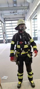 Auch legte Kai seine Schutzkleidung an. Gerade als er sein schweres Atemluftgerät schulterte, ertönte einer von mehreren Alarmen. Die Einsatzkräfte kamen die Stangen heruntergerutscht, zogen in Windeseile ihre Kleidung und Stiefel an und rannten zu ihren Fahrzeugen. Schon gingen die Tore auf, die Feuerwehr rückte aus und ließ alle staunen.