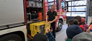 In der Fahrzeughalle zeigte Feuerwehrmann Kai wichtige Werkzeuge und Hilfsmittel wie z.B. einen Stromgenerator, alles wohlgeordnet und griffbereit im Einsatzfahrzeug. Geräte durften herumgegeben werden, wobei ihr hohes Gewicht viele überraschte.