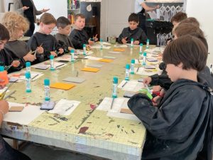 Gleich nach dem Empfang in der Druckwerkstatt im Kinderkunsthaus ging es los: Die Kinder der 2bi schlüpften in schwarze Malerkittel, suchten sich einen Platz an den riesigen Tischen und sammelten Erfahrungen mit der ersten Technik, der Monotypie.