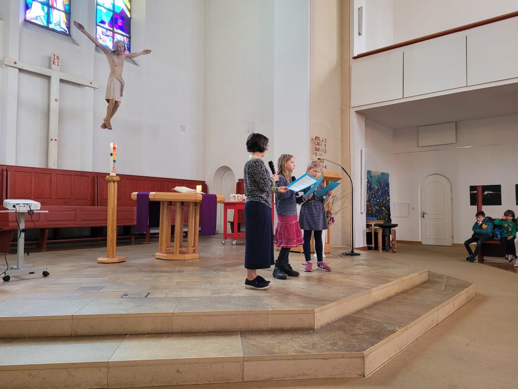 Flora und Emilia aus der 3ci waren so lieb und erzählten eine ganz besondere Ostergeschichte. Sie handelte von Mia, Tessa und der Osterraupe. Dass alle Kinder so kräftig mitgesungen haben, war eine großen Freude.