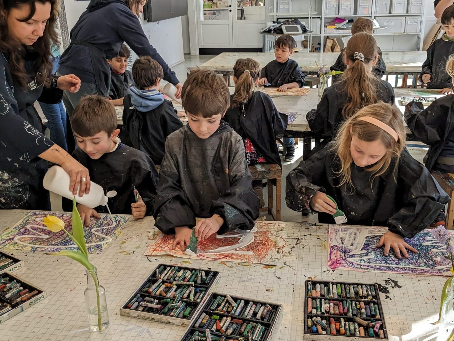 Zum Abschluss durften die Jungen und Mädchen noch eine ganz besondere Technik ausprobieren: zwei Wachsmalkreiden wurden in beide Hände genommen und damit wie wild auf große Bögen gekritzelt. Nach zehn Sekunden gab’s zwei neue Farben und so weiter – bis das ganze Papier vollständig bunt war. Nun wurde weiße Acrylfarbe mit Spachteln auf dem Kunstwerk verteilt und jeder durfte seine schönste bunte Stelle „frei“ lassen. Eine fantastische Wirkung!