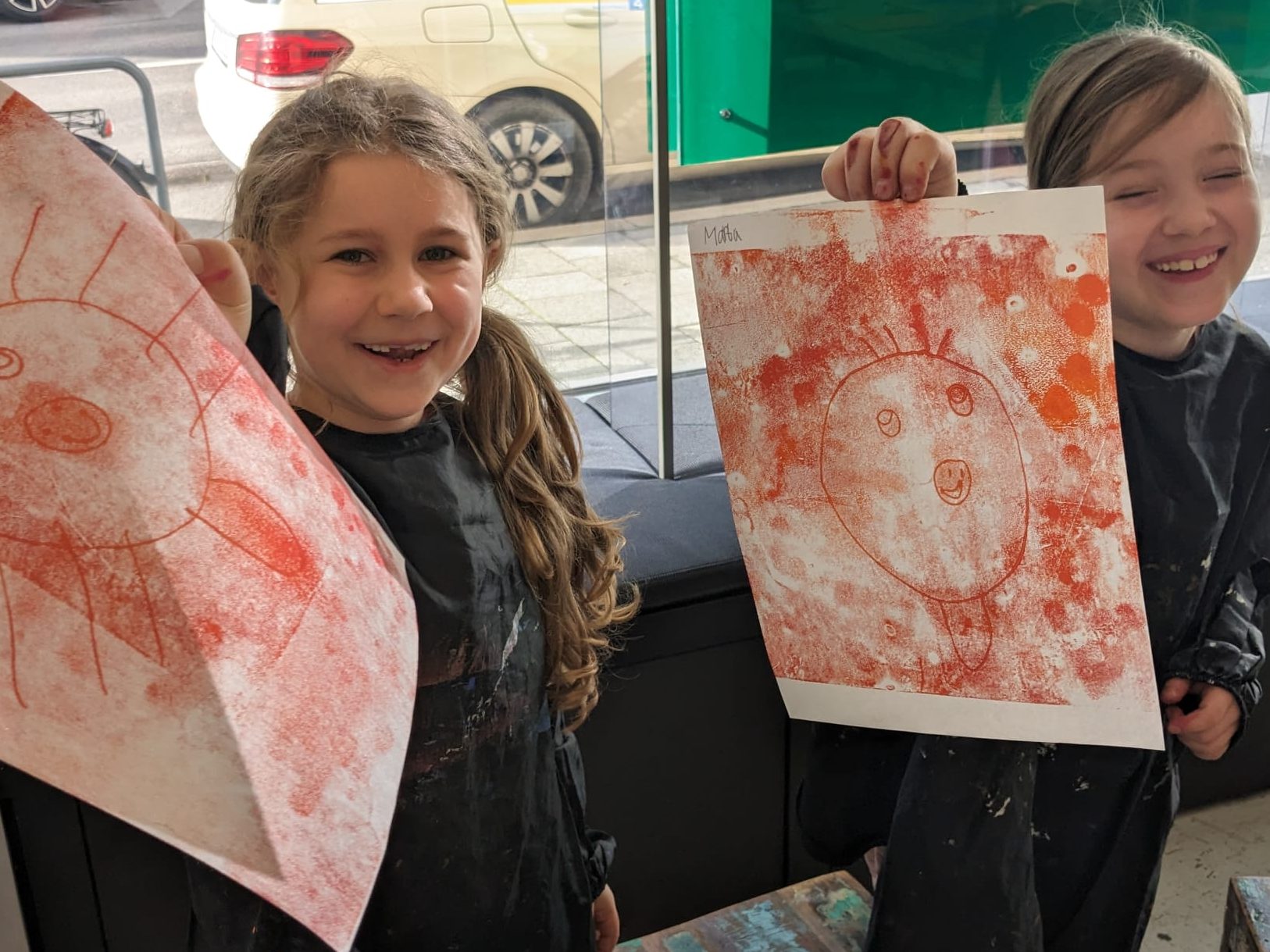Farbe aufs Glas, mit einer Rolle verteilen, Papier darauf legen und mit einem Bleistift zeichnen. Nachdem das Blatt umgedreht wurde, kamen unter anderem farbige Raketen, Fantasietiere und Erdbeeren zum Vorschein. Der Überraschungseffekt beim Abziehen der Drucke zauberte allen Kinder ein Lächeln und ein Ohhh oder Ahhh ins Gesicht.