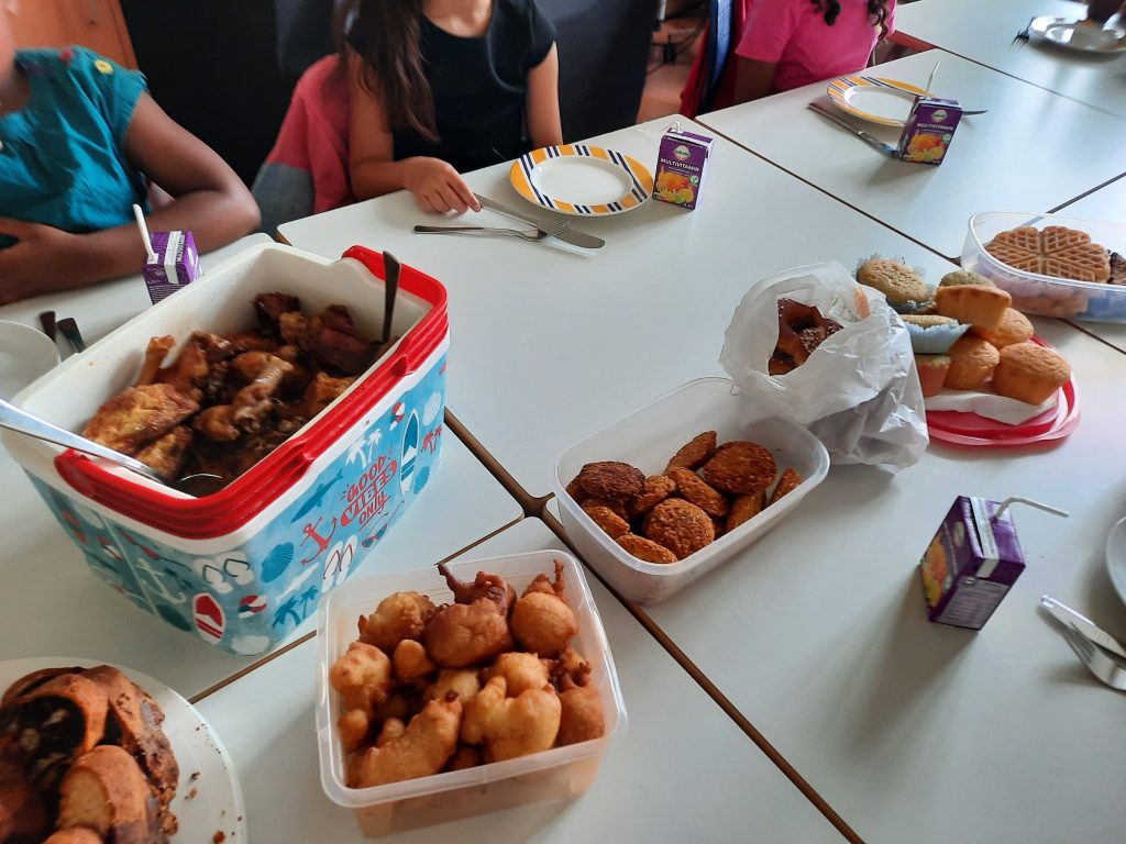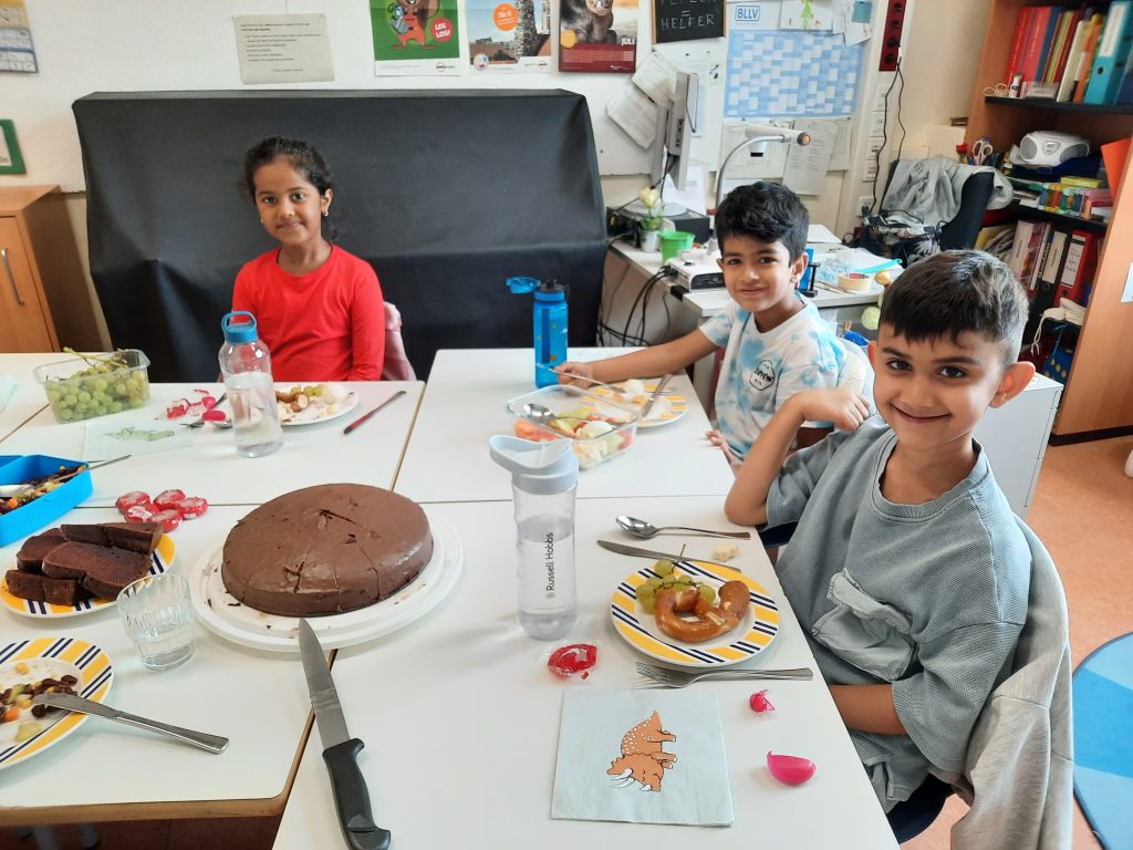 In der letzten Stunde durften sich die Kinder deshalb einmal selbst feiern. Beide Vorkurse veranstalteten ein gemeinsames Frühstück, bei dem fröhlich erzählt wurde. Kuchen, Waffeln und Muffins waren natürlich beliebt. Aber für besonderes Interesse sorgten typische Gerichte aus den Herkunftsländern der Kinder: Börek, Falafel, Puffpuff oder scharfer Reis mit Hühnchen. An dieser Stelle einen großen Dank an die Eltern!