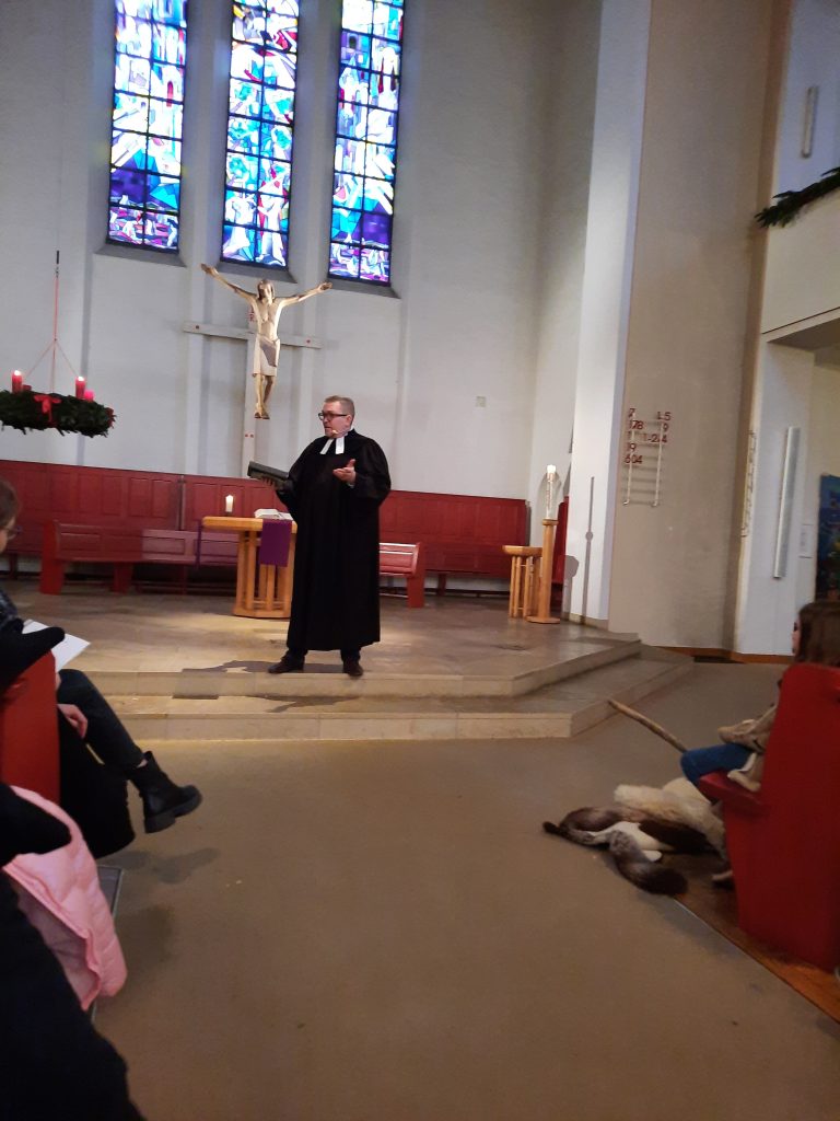Gestaltet wurde der Gottesdienst von den Schülern und Schülerinnen des Evangelischen und Katholischen Religionsunterrichts. Zusammen mit Frau Beständig und Frau Schmidt hatten sie das Krippenspiel „Eine sonderbare Nacht“ eingeübt und hervorragend vorgeführt.