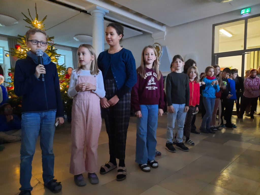 Begonnen wird traditionell mit „Wir sagen Euch an den lieben Advent“ – jeden Dienstag kommt eine Strophe hinzu. Bei der ersten Statio trugen Kinder aus der 4bi das Gedicht „Die Weihnachtsmaus“ vor und die Klasse 3a sang „I hear them“, ein englisches Weihnachtslied.