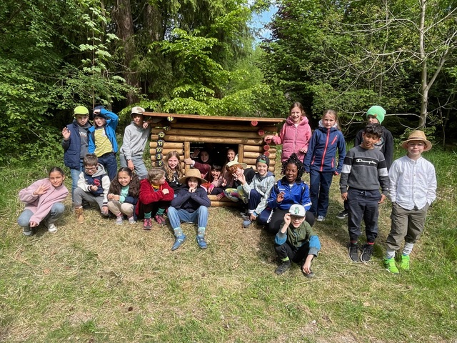 Zuerst haben wir Kinder gemeinsam eine kleine Hütte aus Holzbalken gebaut. Dabei waren zwei Kinder die Architekten und haben den anderen die Anweisungen gegeben. Im Anschluss sind wir einzeln einen Pfad entlang gelaufen, dabei gab es viele Holztiere zu entdecken: Reh, Fuchs, Maus, Specht, Dachs, …