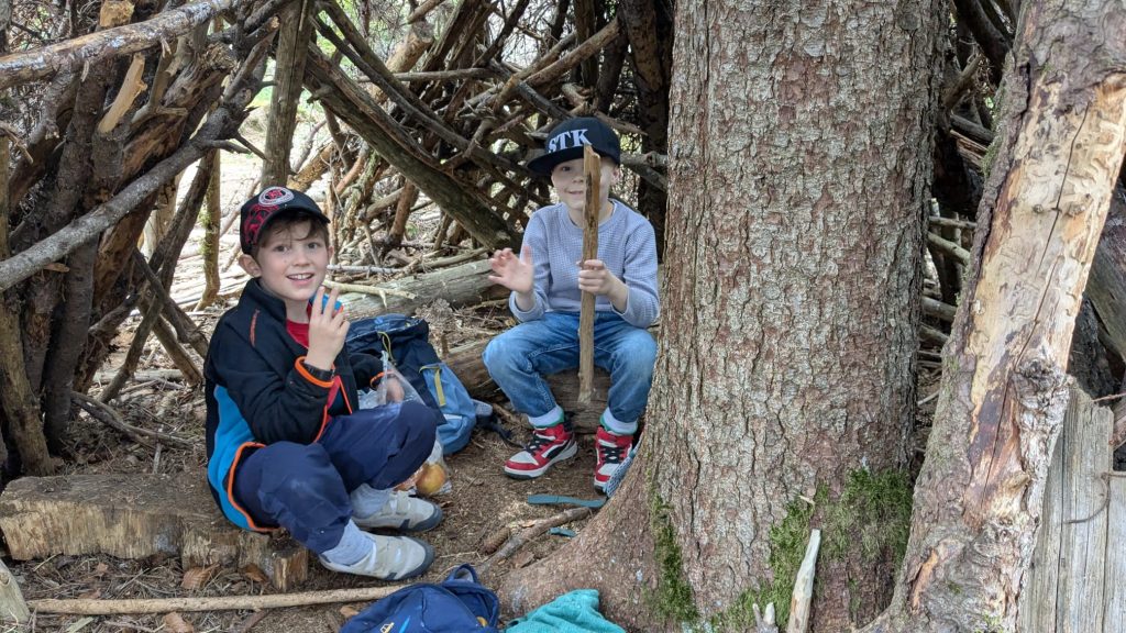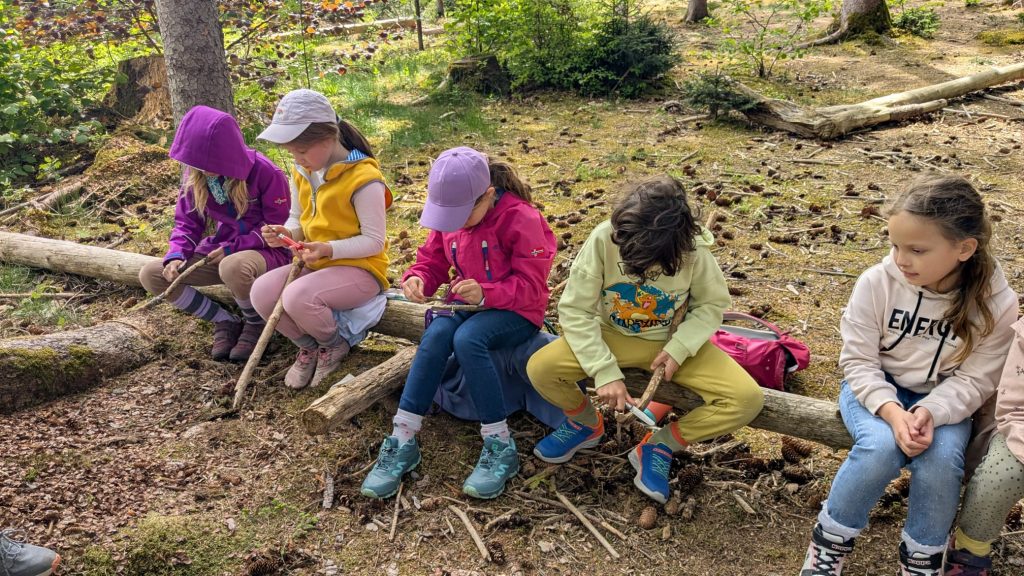 Zuerst wurden die winzigen Bewohner des Waldes in Becherlupen bestaunt, von fleißigen Ameisen bis hin zu den vielen Beinchen eines Hundertfüßers. Mit viel Eifer und unter Anleitung schnitzten einige Kinder mit den eigens mitgebrachten Schnitzmessern ihre Stöcke. Schwere Stämme wurden geschleppt und Tipis gebaut und als Unterschlupf genutzt.