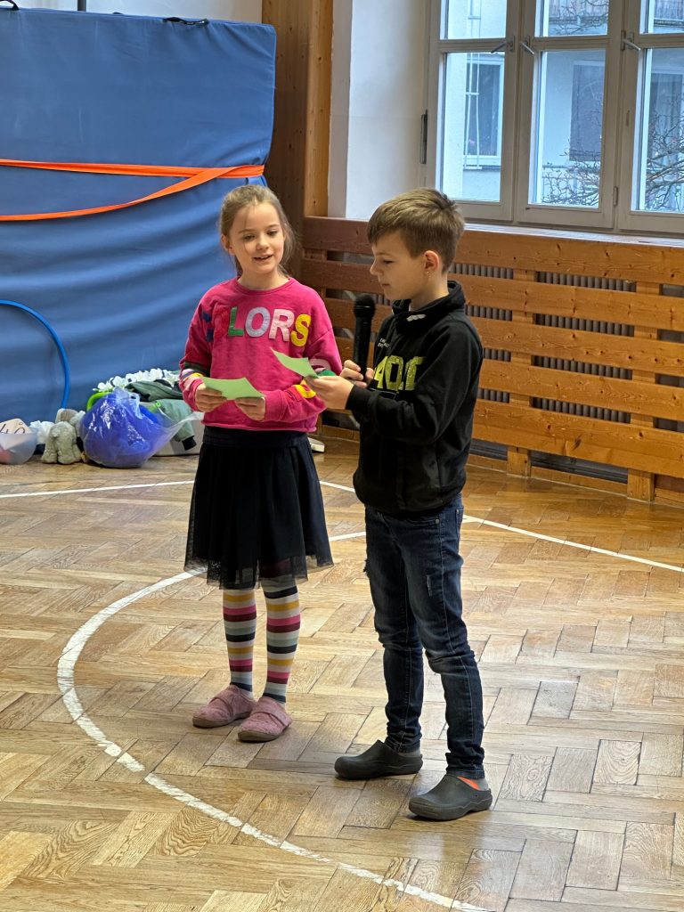 Die Moderatorin und der Moderator aus der Klasse 3a führten durch die Veranstaltung. Dabei wurden die gesammelten Wünsche der Schulkinder aus allen Klassen für das Jahr 2025 vorgetragen.