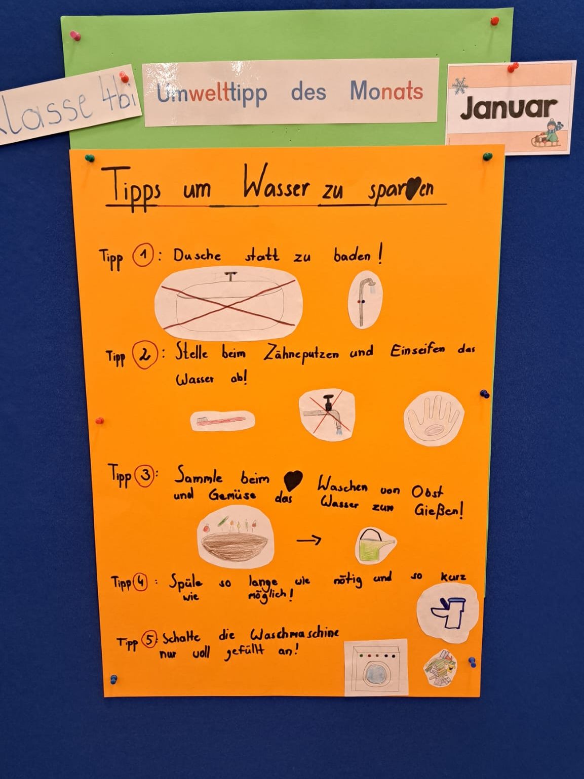 Die Klassen 3a, 4a und 4bi beschäftigten sich mit dem Thema Wasser Sie trugen ein Gedicht vor, sangen ein Lied und stellten uns dann den Umwelttipp zum Wasser sparen vor.