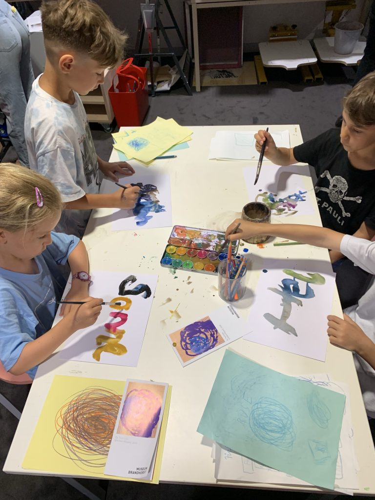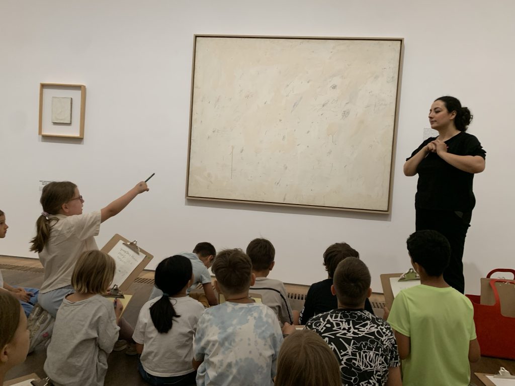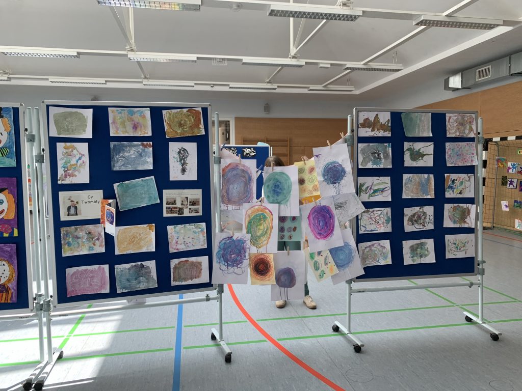 Am 4.7.25 ging es ins Museum Brandhorst, wo die Kinder eine Führung zu den Werken Cy Twomblys bekamen und zu den Werken skizzierten. Im Anschluss konnten die Kinder verschiedene Kunsttechniken ausprobieren, um Bilder wie Cy Twombly zu malen. Diese haben wir im der Kunstausstellung beim Sommerfest präsentiert.