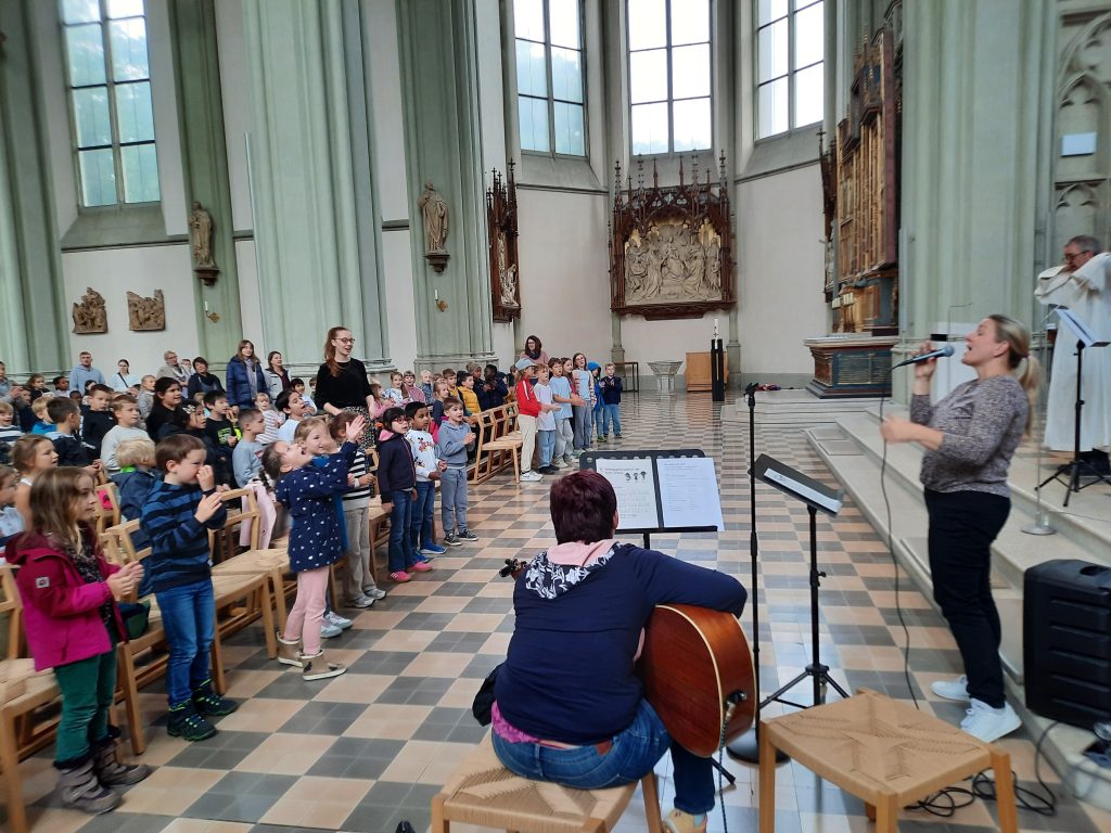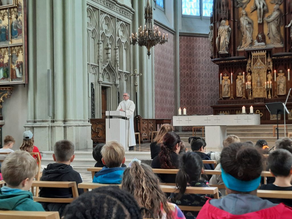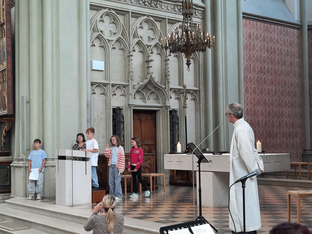 Unser Anfangsgottesdienst in der Kirche Heilig Kreuz fand dieses Jahr erst in der zweiten Schulwoche statt. So konnten Kinder noch fleißig Fürbitten üben und ein kleines Anspiel proben.