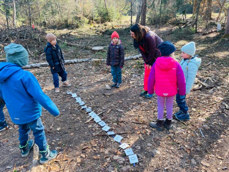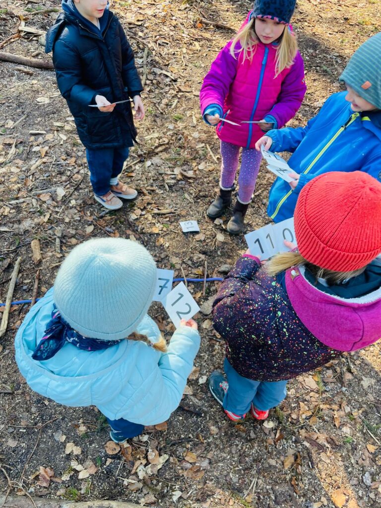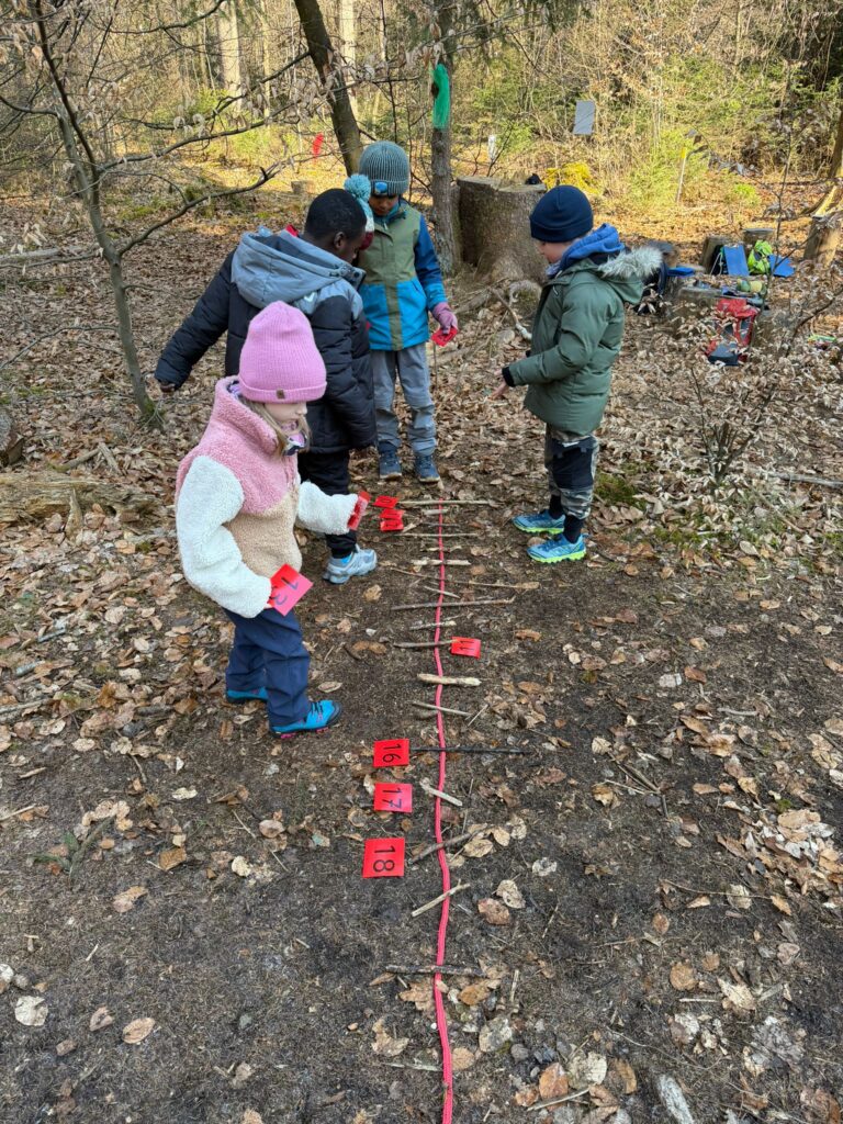 Nach einer kurzen Stärkung auf den Baumstümpfen, erarbeiteten alle in Gruppenarbeit den Zahlenstrahl bis 20 mithilfe von Seilen und gesammelten Ästen im Wald. Schon wieder meldete sich der Hunger und es gab eine Pause mir Brotzeit und Toben.