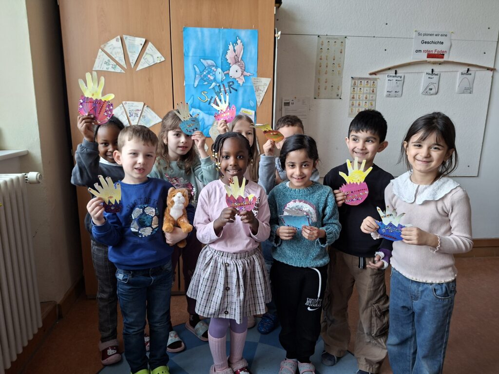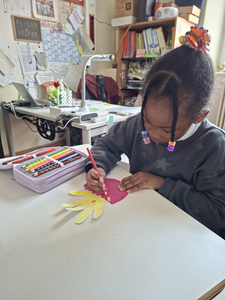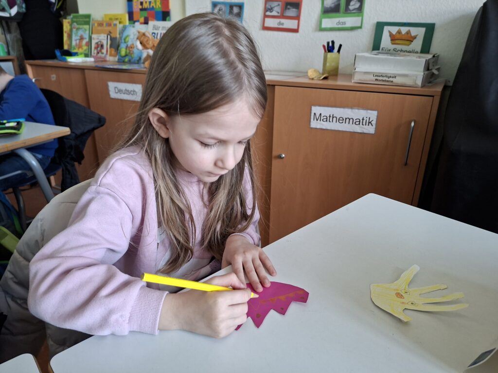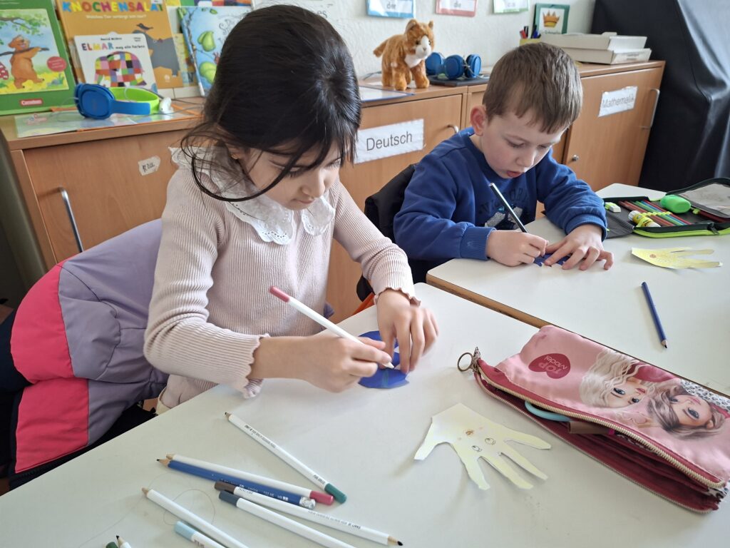 Mit viel Eifer, Farbe und Kreativität verwandelten die Kinder ihre eigenen Handabdrücke in Osterküken. Dazu malten, schnitten und gestalteten sie Eierschalen, in die die Küken gesetzt wurden.