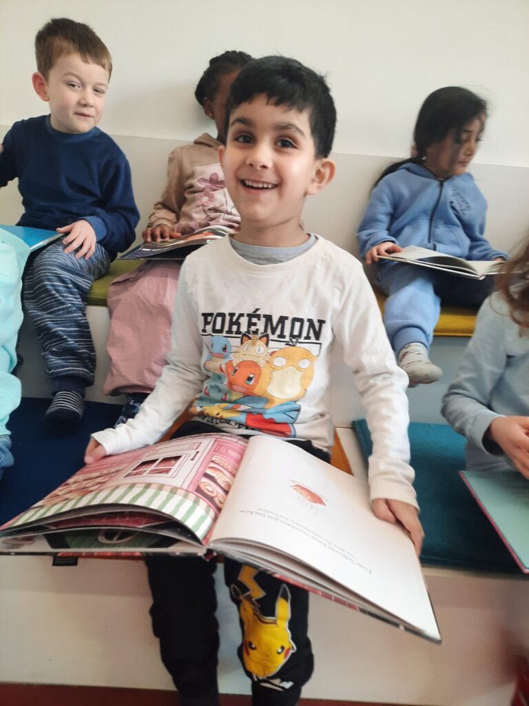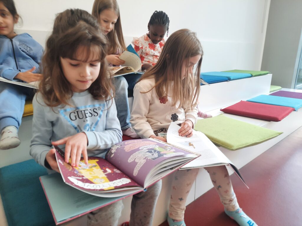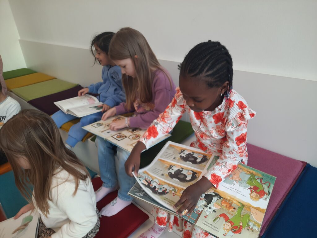 Anschließend stöberten die Kinder selbstständig durch das Angebot und entdeckten einige Bücher, die sie in den nächsten Wochen in Ruhe im Vorkurs anschauen möchten. Darauf freuen sich alle sehr!