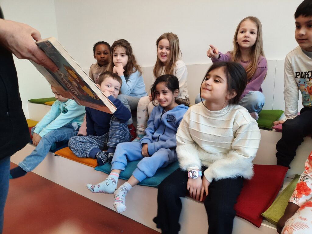 Frau Hoiß von der Stadtteilbibliothek empfing die Kinder in der noch geschlossenen Bibliothek und begrüßte sie mit einem mehrsprachigen Lied. Dann las sie aus dem Bilderbuch „Kann ich bitte in die Mitte?“ vor. Dort möchten Tiere gemeinsam ein Buch anschauen, doch immer kommt noch ein neues Tier hinzu und möchte unbedingt mit aufs Sofa.