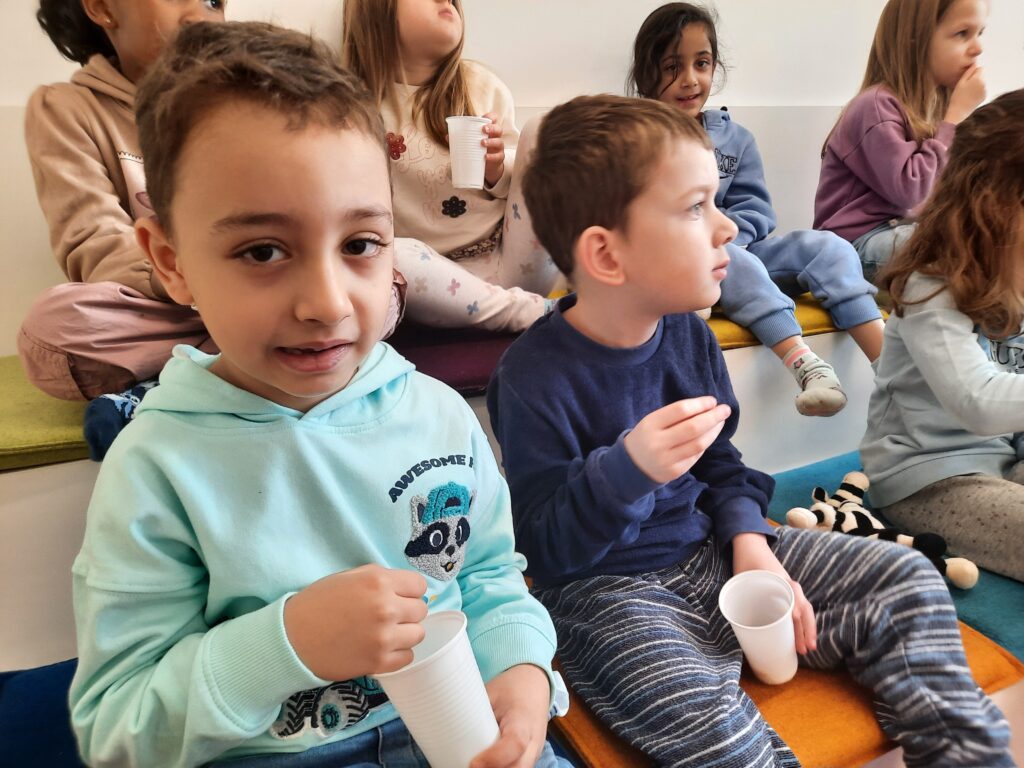 Die Kinder hörten gespannt zu, lachten, suchten und zählten Tiere und Gegenstände auf den Bildern. Am Ende freuten sie sich, dass alle Tiere einen Platz gefunden hatten und gemeinsam lesen konnten. Zum Buch gab es Erdnüsse zum Knabbern, was für Extrafreude sorgte.